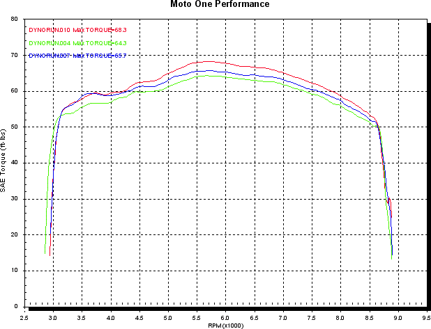 So, to the first graphs. This is the shop demo 1000DS SS ie. Green is all std. Blue is with some slip on mufflers. Red is with slip on mufflers and DP air filter kit. All runs are done with the std ECU, and no fuel changes. This shows 84 Hp std, and 89 Hp with the (not fully developed) mods. Very cool. Power first, then torque.