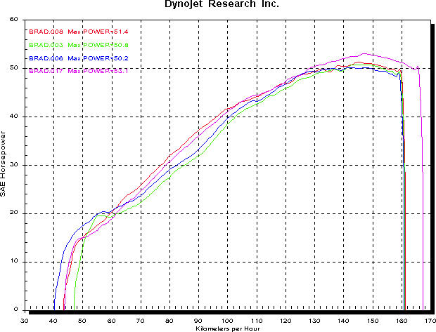 So, overall, I can say that the cam timing changes had a small, but noticeable effect. The top end loss I have noticed ( I think ), but only when holding it open far longer than normal, and it is only 2 or so hp at 8000 rpm. The only thing I cant judge is the consistency of the std cam settings. Whether its worth the money Im not really sure of yet. Maybe a quick job with offset keys is more appropriate for the 600. I guess having an owner try it out would be the best test, but I dont like disappointing people.