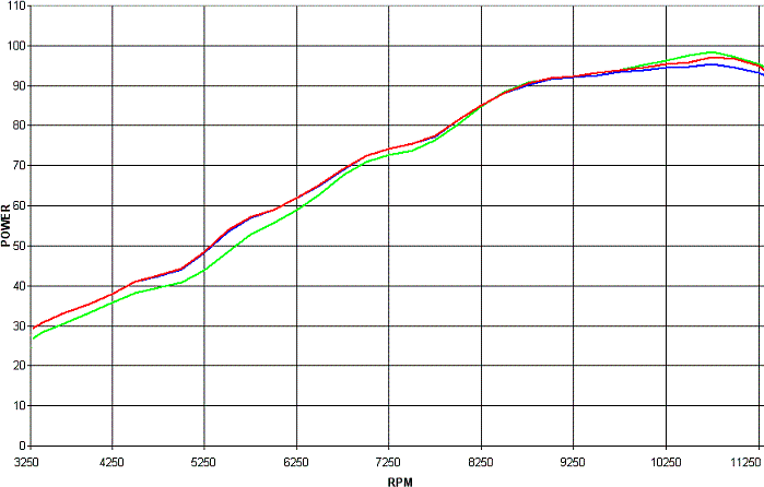 As this bike was a bit rich to start with in terms of best dyno power, and I know that leaning it out as it was would have made more peak power, the next graph shows the before compared with two after runs. One being best power and the other equivalent air/fuel ratio - equivalent air/fuel ratio meaning that the power figures given at each RPM point are with the same air/fuel ratio as the before run. This removes any improvements based on the air/fuel tuning alone which would make the result look unrepresentatively better than it is. The difference is only slight and mainly over 10,000 RPM. But it’s just to make it a true before and after comparison. Green is before, red best after power, blue equivalent air/fuel ratio power.