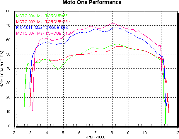 You can see how much the torque and power has picked up up to the torque peak at 8,200 RPM it’s between 23 and 30% better, as it should be given the 23.5% increase in capacity. The shape of the curve is very similar too, with the tuning peaks at the same RPM as before. Peak power is up only 13% (without any real tuning), but power isn’t related to capacity as much as airflow, and we didn’t really make any airflow mods (porting, bigger valves, etc) to it. It may make some more power with tuning (which is to come) and I’m sure retarding the inlet cams would help too if we were chasing a dyno number, but that’s somewhat academic given it’s a road bike. I’m sure part of the reason the 999 is not further ahead in the midrange is the difference in inlet cam settings. How the 999 would work with 106 degree inlet centrelines would be interesting as it has 3mm bigger valves again than the 749. Adding a full system as compared to the Termi asymmetric kit would help the top end power too, as it does for any model in the 749/999 range. On the road the difference is skewed somewhat by the fact the 999 as std runs 15/36 gearing and the 749 runs 14/39, both with the close ratio gearbox. With this shorter gearing the 924 really moves. It may even benefit from longer gearing to tone it down a bit. Home | Blog | Facebook | Service Enquiry | Products | Reports | The Dyno | Disclaimer | Contact Us |