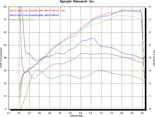 So, to the first graph. This is the shop demo 800M ie. Green is all std. Blue is with some slip on mufflers and the idle trimmer increased 10 points. Red is with slip on mufflers, DP air filter kit and the idle trimmer increased 25 points. This shows 73 Hp std, and 78 Hp with the (not fully developed) mods. Very cool. Power first, then torque.