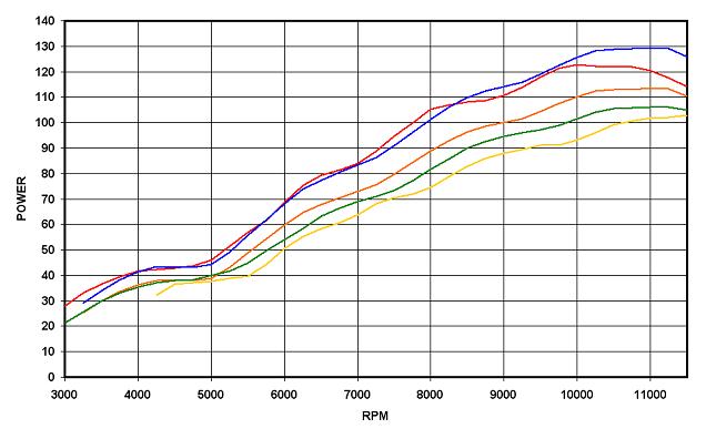 853, R and Stuff - Written 07/09 Summary: 748 and 748R with 94mm and 96mm big bore kits and various mods 748R We did an 853 conversion to a 748R late in 2008 the first 853 kit I’d been involved with. Funny how it’s a popular mod in lots of places, but not Melbourne, Australia. We used Pistal pistons, the specific 748R ones as the 748R uses small end located Titanium rods. If you fit normal 748 style pistons meant for big end located rods the rods are not held at either end and can move sideways on the crank up to just over 2mm. Chris @ CJS said he pulled apart a 748SPS (Ti rods) that someone else had fitted with std 748/916 big end located rod pistons and although it had good compression, it had a heap of blowby when running and was a bit of a dud. Correct small end located pistons fixed it. The big end located rod pistons have quite a bit of side clearance between the piston and rod at the small end usually 1 to 3mm depending on the piston manufacturer. Whereas small end located rod pistons have about 0.40mm side clearance. We sent the cylinders out for boring and replating locally and the heads went out for port work. Similar to the last 748R we had ported, except this time we also had some exhaust port work done. Still nothing too major (or expensive). It went back together with the usual inlet trumpet extensions, throttle body outlet boring and the same 104/108 cam timing we’ve been running on std capacity 748R. I wasn’t sure if that cam timing was going to hold it back at all, but the owner was happy for it to be more midrange than top end orientated. Before we got it together I did some projections for how much power it might make using the previous 748R with port work results. You can export run data out of the Dynojet software as a text file and play with it in a spreadsheet. So I just multiplied the previous curve by 853/748 and got 130hp. Given that you usually don’t get the full proportional increase in power due to power being an air flow thing and not capacity I was thinking a bit over 120 was realistic. Although the torque should increase from 59 to 68 ft-lb, as torque is almost totally capacity based. And generally the Desmoquattro engines tend to produce more torque per cc the greater the capacity, so it wouldn’t surprise me if it made more than that. So we got it going and went to the dyno and did some runs to develop a custom eprom to suit, with the WOT runs being fuelling +/- to see what it liked where. Again I exported the data out into a spreadsheet to compare it to the graphs I’d already generated, and found the result to be pretty good. The graph below shows this bike in red, the predicted output in blue, the previous ported 748R in orange, a non ported cam timed, extended trumpet, bored throttle 748R in green and an untouched 748R in yellow. Power first, then torque. As you can see, the result was a bit more than projected increase in torque and a less than projected increase in power, peaking at 69 ft-lb and 123hp. The extra capacity has also moved the torque peaks down a little. The fall off of torque over 10,000 rpm is quite likely related to some extent to the cam timing we were running, and pulling the inlets back a few degrees to 110 or so should have held the torque better for more power. I discussed this with the owner who was much more midrange orientated and so happy to leave it the way it was. Generally lowering the peak power rpm will help reduce the rpm it’s likely to see in use too and that’s a good thing. And given he’d ridden in an as delivered 748R and ridden out on this, the change he was going to feel was bigger than a few more hp over 10,000 rpm. The graph below shows the change from one previous as delivered 748R I’d dynod compared to this one. The owner didn’t actually think it felt a lot faster, but was quite surprised by how fast it was going when he looked down at the speedo and by how fast he found himself going into corners. This is often the response you get when you deliver a flat torque curve, even though it now has at least 30% more torque for much of the rpm range. It also makes surprising torque for its capacity. Compare it to a cam timed 996 or 996SPS or 998S which usually make 75 76 ft-lb, giving them around 76 ft-lb per litre, this 853R makes 69 ft-lb, giving it 81 ft-lb per litre. I think this has a lot to do with the longer duration exhaust cam, but also typically of the other longer exhaust cam motors it has the midrange hole from 4,000 to 7,000-ish. The graph below compares it to a cam timed 996. It doesn’t catch the 996 until after the 996’s power peak, but it’s still pretty impressive. 748 Strada One of my customers has a 748 Strada he fitted an 853 kit to. He set the cam timing at 108/108 and had fitted one of Doug Lofgren’s 853 eproms as sold by Ultimap the UM097DL. Apart from that it was std with slip ons, in this case the old Skorpian pipes which are now know as Akropovic. We ran it on the dyno to see how the fuelling worked for this cam timing, but due to a couple of issues only gave it one WOT run. So it may have made a little more power than this as it often takes 3 or 4 runs for the power to settle. Also the fuelling was pretty good for an eprom that was developed on a bike with std cam timing. Graphs below show power then torque and air/fuel.