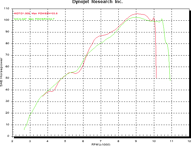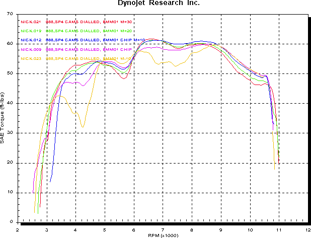 A pretty nice result you might think. Only thing is, its not before and after. The red line is the base, or standard, run for the 851 SP3 featured in another report. The green line is the base run for this particular 888 SP4. Given that these two bikes are mechanically supposedly identical, with the same cams, inlet, exhaust, valves, etc, I found this quite odd. The difference is not small, with at least 6 Hp variation from 6,500 RPM on. Not much I could do about it, as the SP4 had good compression and seemed otherwise very healthy. The owner was the man who bought it brand new too, so we knew the history also.