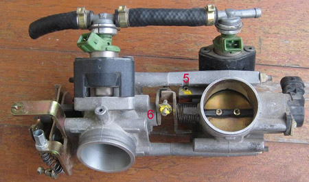 2V Non Linear TPS Baseline Adjustment - Written 06/08 Summary: How to set up 2V throttle bodies with the Non Linear TPS. Discussion of idle mixture setting for various ECU: P7 and P8, 1.6M, 1.5M and 5.9M. Graph of Linear versus Non Linear TPS output showing the difference. NOTE: READ THIS BEFORE YOU HOOK UP YOUR DIAGNOSTIC SOFTWARE AND START PRESSING “TPS RESET” LIKE A CHILD WITH A NEW TOY. The same throttle bodies have used on nearly all injected 2V from ST2 onward. 907 are very similar from memory, but I haven’t seen any of them for quite a few years. Those pictured in the following report are from a ST2, and have IW031 or “green end flow” injectors. The 750SSie and 900SSie also use these injectors. All 620 (well, not all), 750Mie, 800, 900Mie and 1000 use the same throttle bodies with “Pico” IWP043 injectors. These are smaller with a steel body and a brown plastic band around them. They flow a bit more than the IW031. There’s a photo of them below. ’05 or ’06 onward 620 use Bing brand throttle bodies. These differ by having the balance screw (almost not) accessible from behind and no stop for the LH throttle blade. So for these you need to set the idle TPS setting using the RH throttle screw after you’ve carried out the throttle balance (synchronisation). You really need the air box out to do this. That bit might make more sense later. I’m not sure if later S2R800 or 695 use these throttle bodies as well, I haven’t actually looked. But both the 695 (afaik) and 800 have a linear TPS, so this setting procedure is irrelevant for them anyway. In the following photos you’ll notice I’ve numbered all the parts we need to know about in series across all the photos. That way, if I give a number, you know which part I mean.