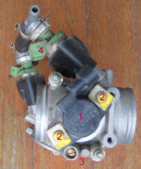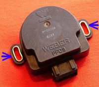 Linear and Non Linear TPS Visually the TPS (1) used on all the 2V motor excepting the 907 looks like the one in the above photo, including the Linear TPS. You can see the TPS adjustment screws (2) with some small steel plates under them. These plates are covering the slots for adjustment. The style of TPS used on the 907 and the 4V motor is shown in the photo below. The adjustment slots are arrowed in blue.