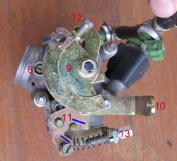 Items viewed from top, mainly to show the location of the RH throttle stop screw. 5 and 6 are shown again from this angle.