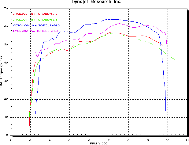 The graph below shows these differences. The green curve is 851 with std 40mm headers and some slip on mufflers. The red curve is 851 with the 45mm ST4 headers and some Staintune mufflers. The blue curve is S4 with some Termi slip-ons. The purple curve is ST4 with std mufflers ( only ST4 curve I have ). Also apparent from this graph is the S4s 9,500 RPM rev limit, controlled by the ECU. Most of the other 4Vs go to at least 10,500 RPM, and the S4 DP ECU lets it rev to 10,000 RPM. The patchiness in the 851 curves is due to the fact that the inductive sensor used by the dyno software to measure RPM doesnt seem to like my 851.