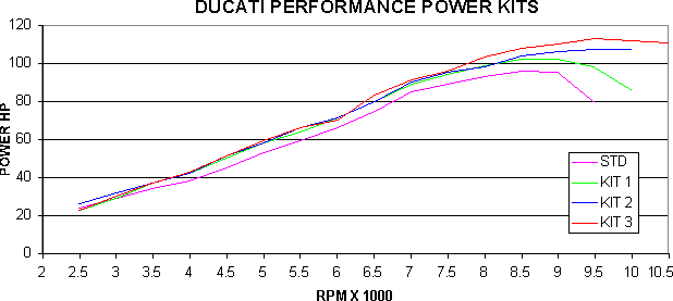 So, it is my contention that the top end power missing from the S4 is due to the smaller exhaust system, and has nothing to do with the inlet cam specs. To further back this up, we can look to the Ducati Performance catalogue. The DP catalogue for the S4 contains dyno graphs for the expected improvements that each kit will bring. The 3 offered kits are