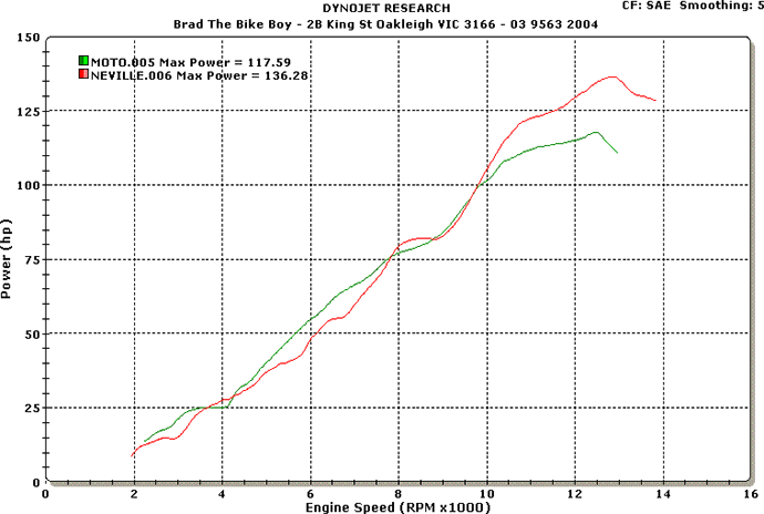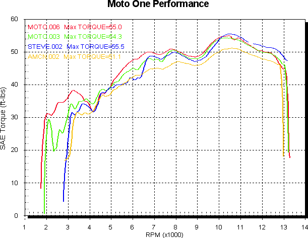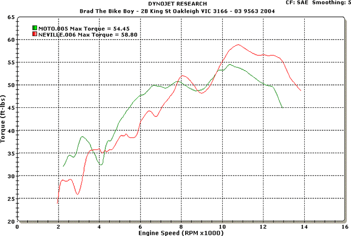MV F4 Base Runs - Written 10/04, Update 01/10 added SPR runs Somewhat surprisingly, I’ve never had anyone come in and ask me to do anything to an MV F4. Not sure why, but there you go. Accordingly, I’d never dyno’d one. So, when I got the chance recently I took a trade in down for a few runs. I also took the opportunity to compare it to a couple of others. All these bikes are running std mufflers and chips. I did fit one of Doug Lofgren’s WCT chips to our trade in to try, so that run is shown also. The bikes are just set up as we normally do. Green is the trade in all std. It had about 20,000km on it at this point and had spent some time at the track, so was well run in. The red curve is the same bike with the WCT chip fitted. The midrange improvement shows the biggest benefit of this chip better fuelling at lower RPM making it a nicer bike to ride. You can see the low end improvement the WCT chip gives more clearly in the torque graph.