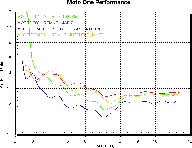 RSVR ’07 Playing With Air box Stuff - Written 06/08 Summary: RSVR’07 model demo run all std, with Remus slip on mufflers and then with flapper disabled, air box lid removed and inlet trumpets extended. I got to have a quick play with our second demo RSVR. I was intending to go further, but as often happens with demo bikes, it got sold. So no cam timing changes or other tuning. First up is a graph of this bike all std and with Remus slip on mufflers and ECU mapping set to engine variant 2, shown against the previous demo RSVR with the same set up. Green is this bike before, red after. Previous demo before is blue, after yellow. You can see this bike was better all std and not as good with mufflers as the previous one. You get that. The after results are pretty consistant though, especially the air/fuel curves shown in the second graph.