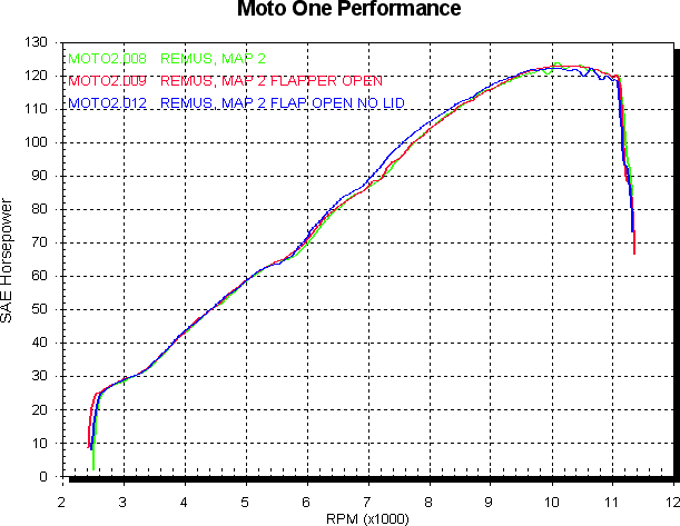After the red run shown above I crimped and unhooked the flapper valve vacuum line to keep the flapper valve in the inlet tract behind the headlights open. I wasn’t sure if it had any influence at WOT, so this was just a simple test to see. As shown below, it didn’t. After a couple of runs like that I lifted the tank, removed the previously unscrewed air box lid and dropped the tank again. The graphs below show the result. Green is Remus slip on mufflers (the red curve from the above graphs), red is the flapper valve in the open position and blue is with the air box lid removed. I’m a little surprised that removing the air box lid hurt the peak power and richened the mixture in a couple of places, but it was a consistant result over a couple of runs. Although I doubt you’d notice it on the road, and you might just notice the improved mid range. Power first, then torque and air/fuel.