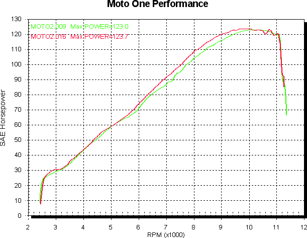 After these runs I shut it off, removed the air box and fitted some extensions I’d made for the inlet trumpets. These were just 30mm long alloy tubes machined to 57mm ID and some spacers with longer screws to hold them in. This effectively mimics the Tuono trumpets which are 30mm longer than the RSVR trumpets. The result was a little better than I expected, as I had expected a top end loss of some sort. Other dyno results I have seen elsewhere for this mod have shown a small top end loss. Given this result I’d be tempted to go maybe 15 or 20mm longer again it certainly couldn’t hurt, as the power is the same, just peaking 400 RPM lower. Green is std 20mm long trumpets, red is with 30mm extensions. Power first, then torque and air/fuel.