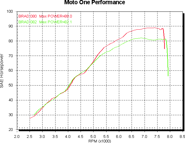 Its certainly odd that restricting muffler volume makes such a big difference at lower RPM, without a huge impact at higher RPM. On the road, it was noticeably lacking down low, but really came on higher up. It would actually lift the front wheel at around 7,000 RPM in first on WOT acceleration, something it wouldnt do with the 2-2. Due to the steeper angle of the torque and power curves at that point, which is only a minor change in this instance. The smoother, more even shape of the 2-2 curve is why it wouldnt wheelie with that system, even though the peak is higher.